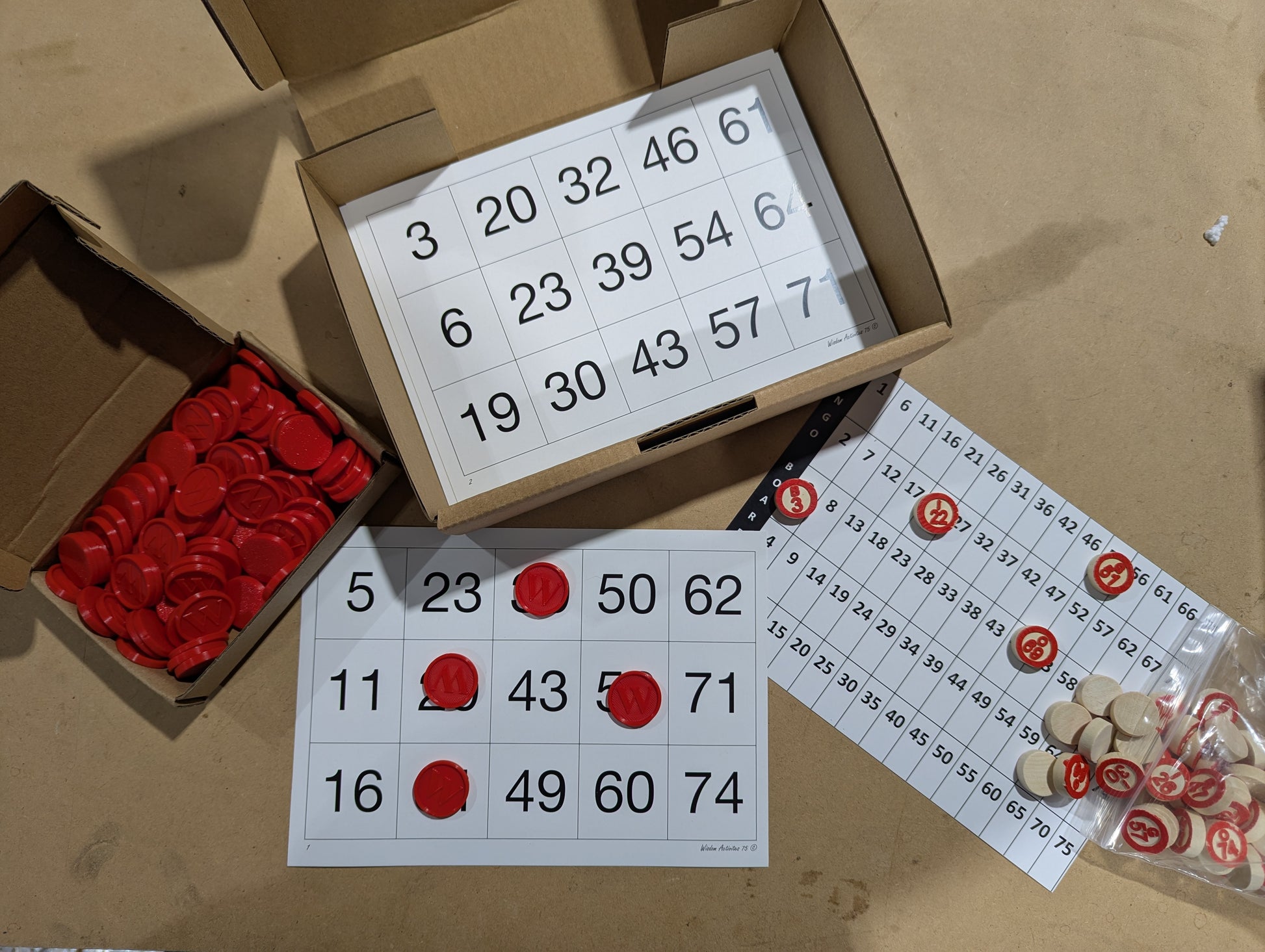 Comes with 30 x 1-75 A5 cardboard playing cards, as well as an A5 caller card. There are approx 300 player tokens, all about the size of a 10 cent piece included. Small wooden calling numbers 1-75. Non-laminated cards ensure budget price.