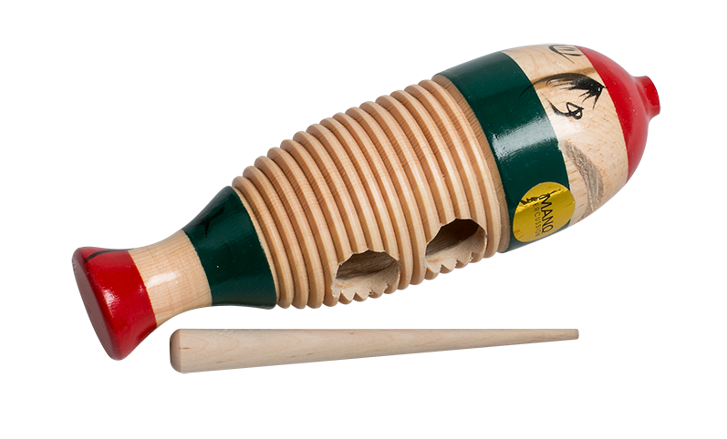 Mini wooden guiro. 8" long, 2" diameter. Fish shaped cylindrical tapered shell with red, natural and green coloured ends. 3" ribbed playing area with two finger holes. Complete with wooden scraper.