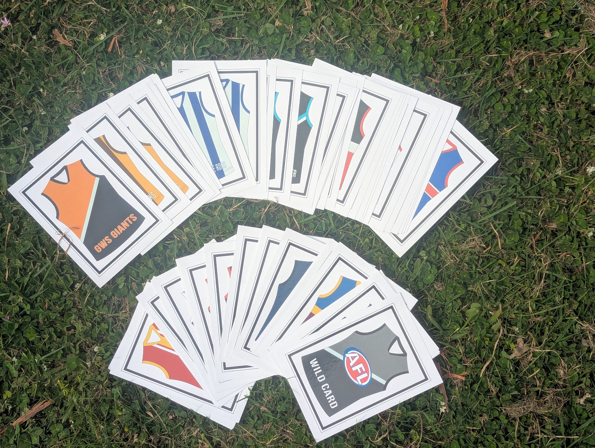 56 A6 cards, each with a large visual format. These footy jumpers are of the AFL teams colours with the team name at the bottom of the jumper. See the image attached.