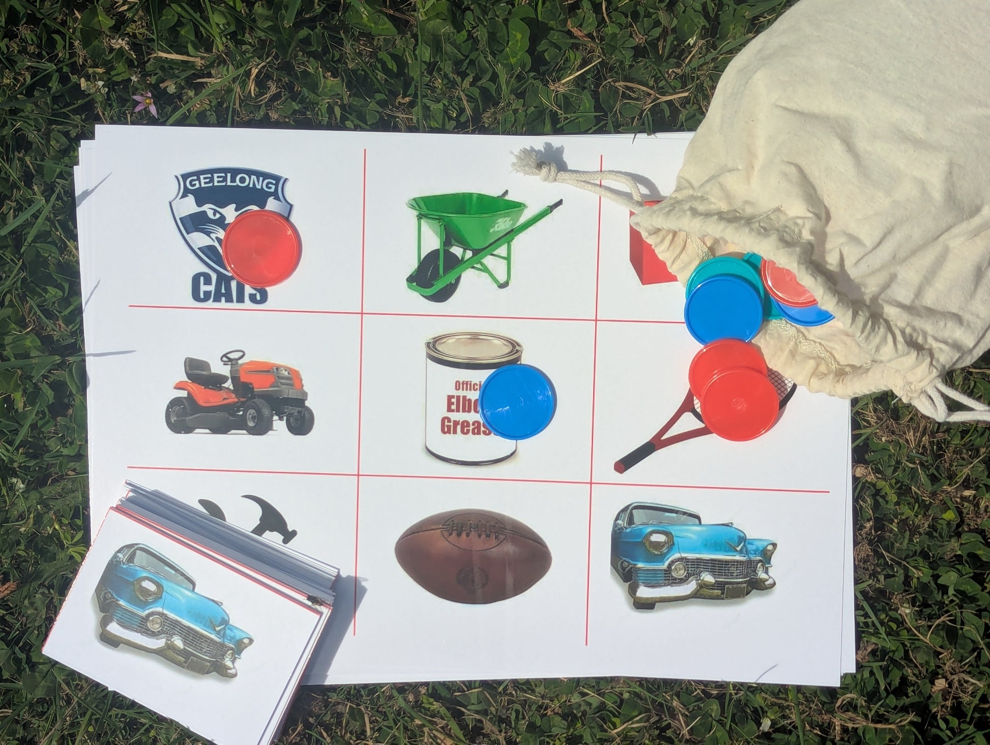 6 A4 Cards each printed with images such as footy emblems, wheelbarrows, grease can, sports ball, lawnmower, work tools, etc.