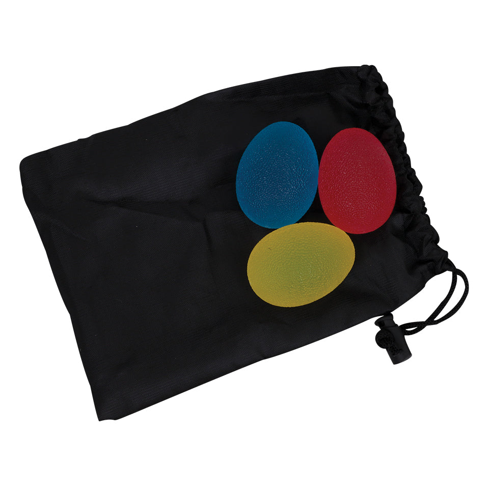 Includes yellow for soft, red for medium and blue is firm. Made of TPE rubber. Each egg measures approximately 4 x 5.5cm.
