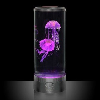 Round jellyfish lamp with 5 colour changing light effects and low voltage adapter. The lamp sits approximately 35cm tall.