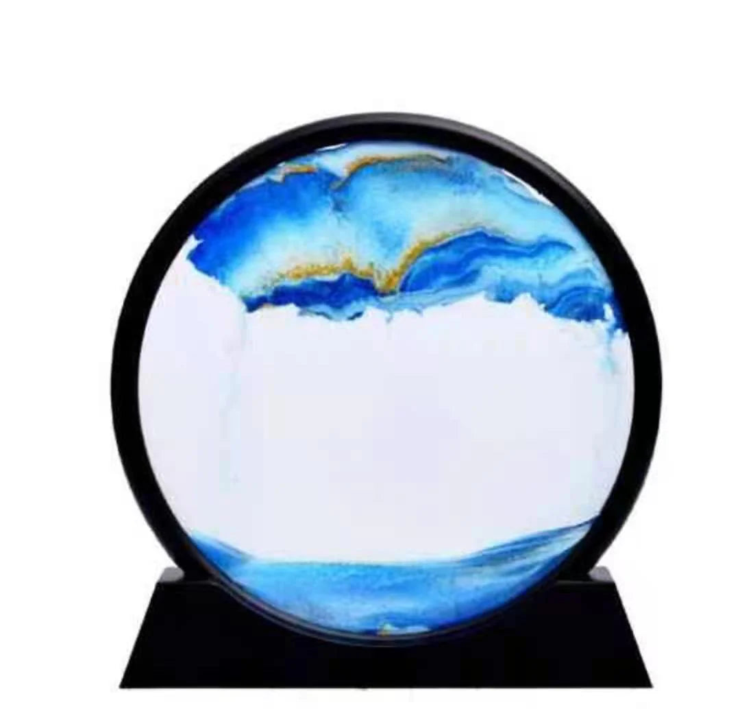 Quite magical to look at and watch. Uses the power of gravity to create an ever-changing piece of sand art. You rotate the glass ring & watch as the various shades of glittery sand shifts into unique landscapes. Great for the bench, bookshelf, desk, bedside etc.