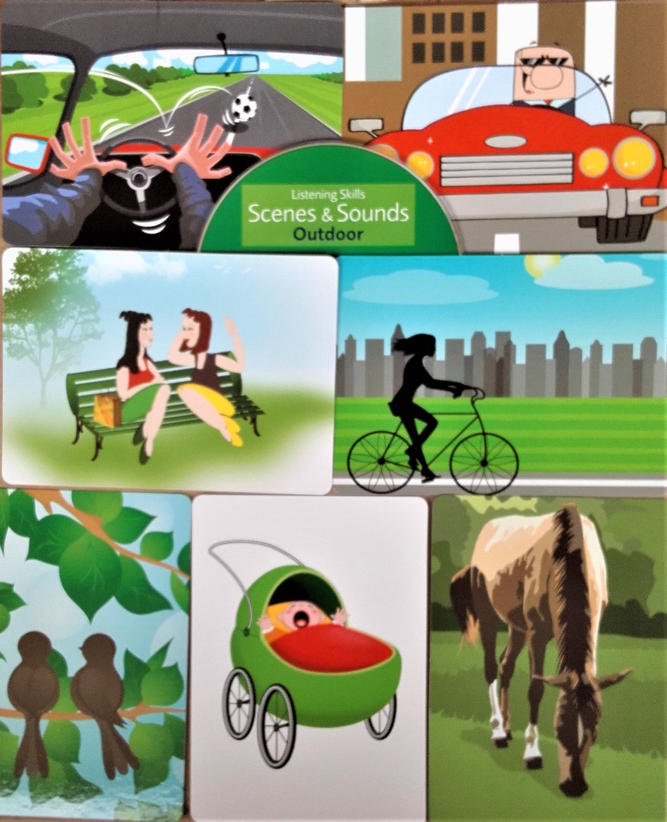 These illustrated cards are designed for matching OUTDOOR scenes with the sounds on a accompanying CD - The combination of scene and sound can help to develop and enhance skills including visual discrimination - auditory discrimination - sound awareness -verbalisation and interaction - The picture comes with an interactive guide book and covers themes - At the Beach - On the Farm - At the Park - In the Street - In the Garden - This will assist someone to connect with their environment - help them remember an outside world if the feel enclosed and trigger memory - 30 Cards and CD