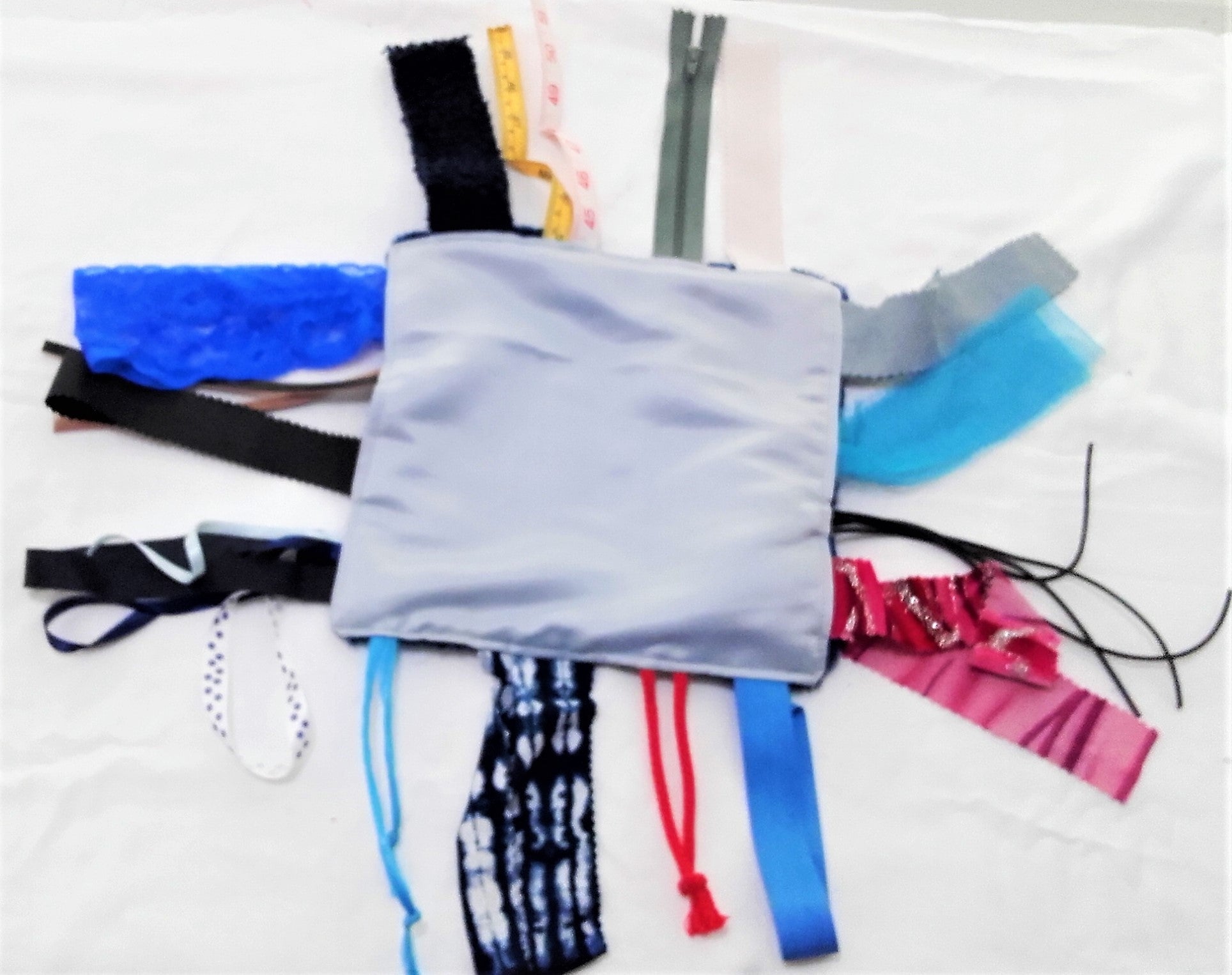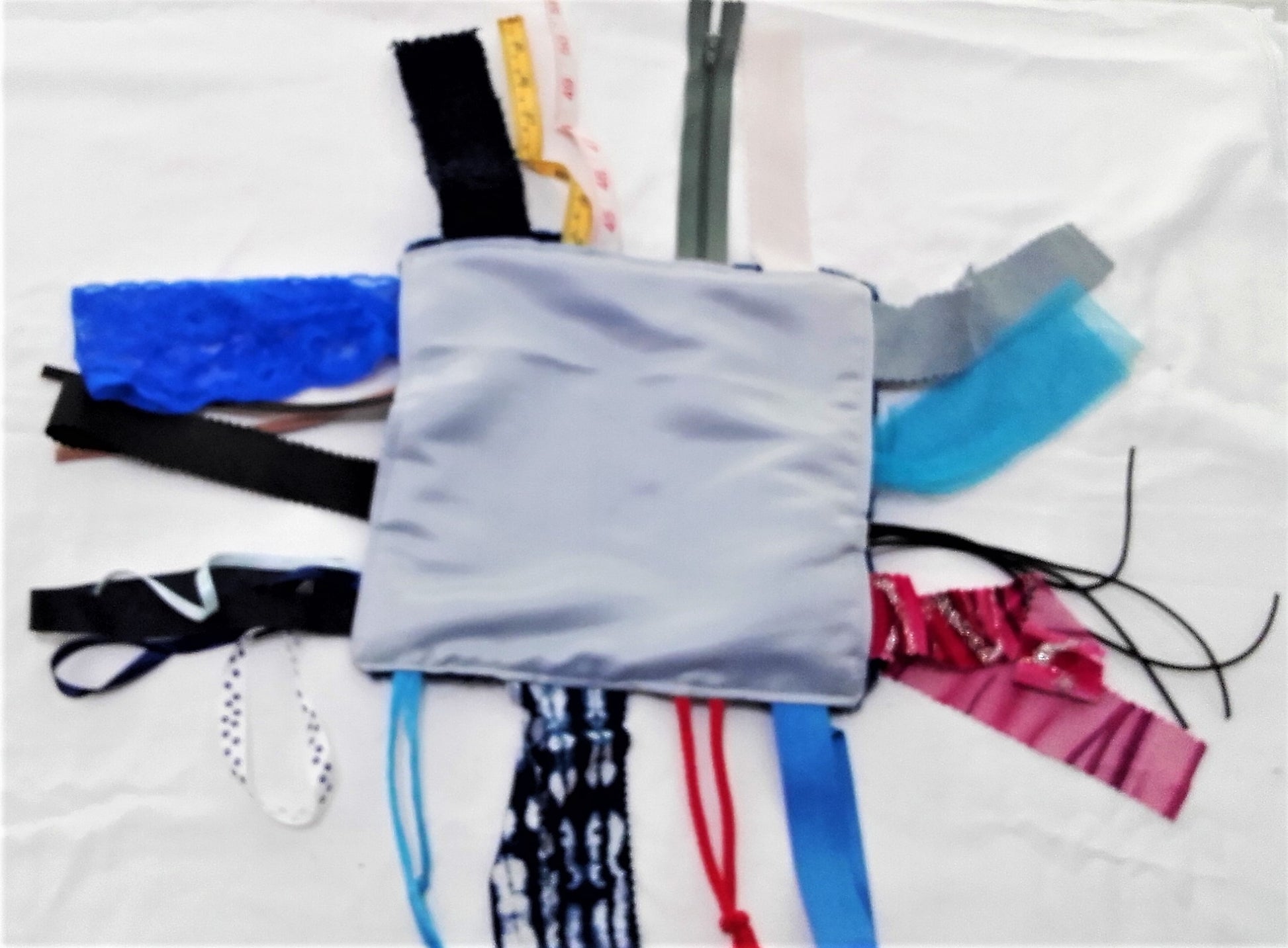 One side is a soft, furry, luxury feel and the other side is a satin material. The tags are long and various, including an old tape measure for a reminiscence effect. Use as a comforter or add to another sensory item. Suitable for later stage dementia.