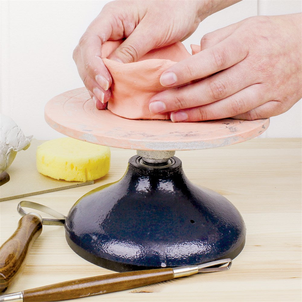This heavyweight banding wheel is ideal for shaping and decorating clay. Features a steel table top and turning wheel which can be rotated. Measures 18cm in diameter.