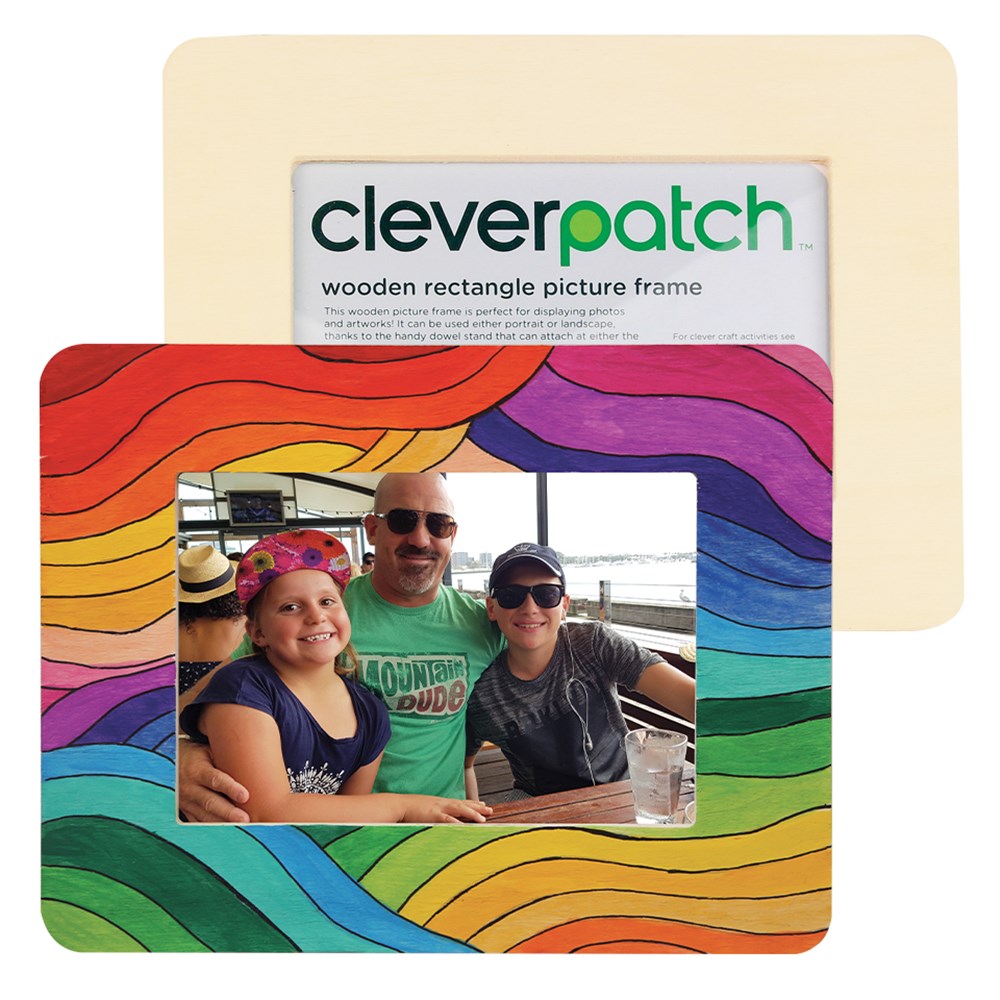 Wooden rectangular photo frame supplied plain for you to create. Includes dowel stand and protective glass insert. Frame can stand portrait or landscape. Frame measures 21.5 x 16.5cm. Space for photo measures 14.3 x 9.5cm. 10mm wood.